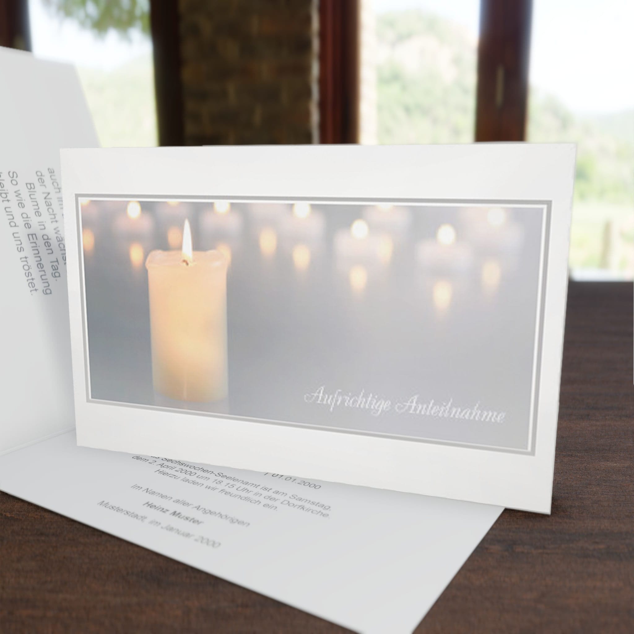 Mit dieser stilvollen Beileidsklappkarte „Kerzen“ Querformat drücken Sie stilvoll ihr Mitgefühl aus