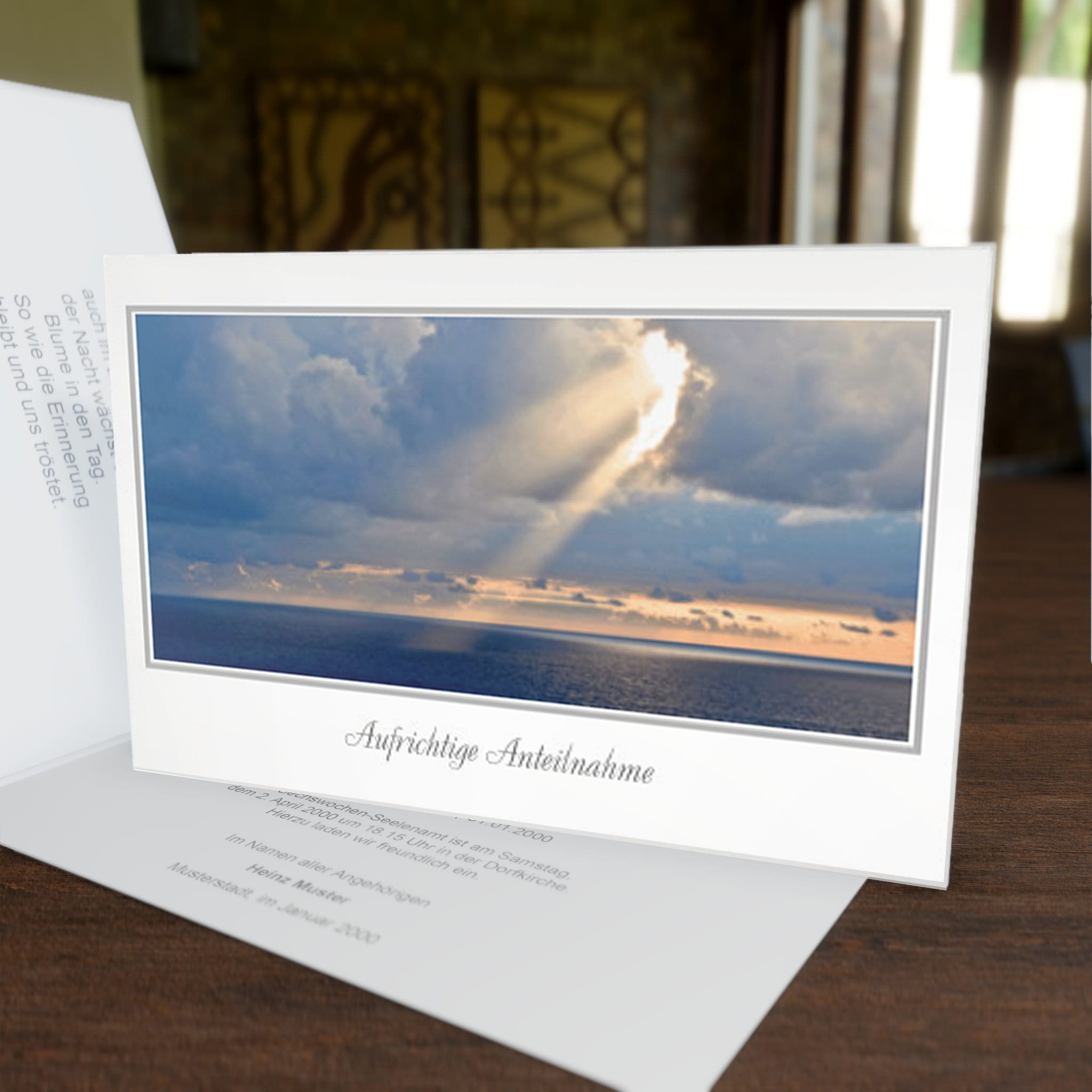 Beileidkarte mit dem Motiv „Sonne u. Wolken“ Querklapp im klassischen Hochformat.