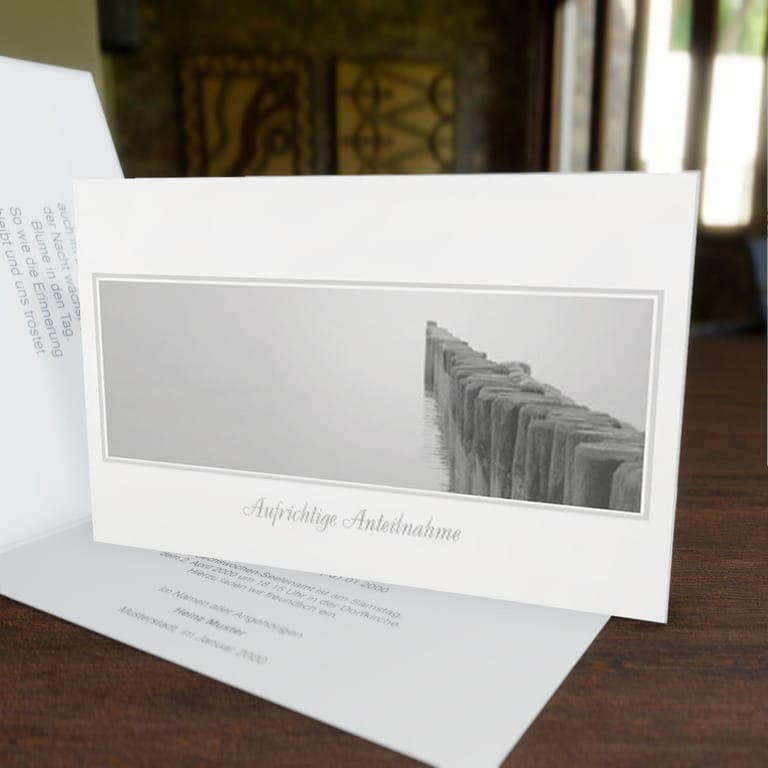 Mit dieser stilvollen Beileidsklappkarte „Steg im Wasser“ Querformat drücken Sie stilvoll ihr Mitgefühl aus