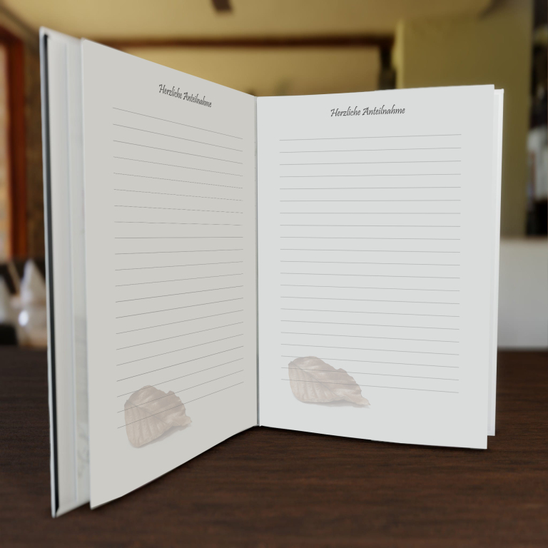 Mit einem Kondolenzbuch 20,5 x 28,7 cm geben Sie Ihren Trauergästen die Gelegenheit für die Angehörigen und zum Gedenken an den Verstorbenen besonders liebevolle und besonnene Worte zu hinterlassen.