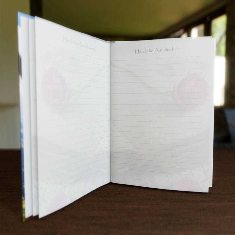 Mit einem Kondolenzbuch 20,5 x 28,7 cm geben Sie Ihren Trauergästen die Gelegenheit für die Angehörigen und zum Gedenken an den Verstorbenen besonders liebevolle und besonnene Worte zu hinterlassen.