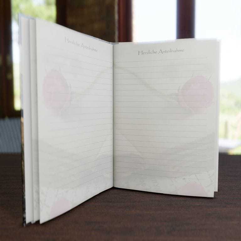 Mit einem Kondolenzbuch geben Sie Ihren Trauergästen die Gelegenheit, für die Angehörigen und zum Gedenken an den Verstorbenen besonders liebevolle und besonnene Worte zu hinterlassen.