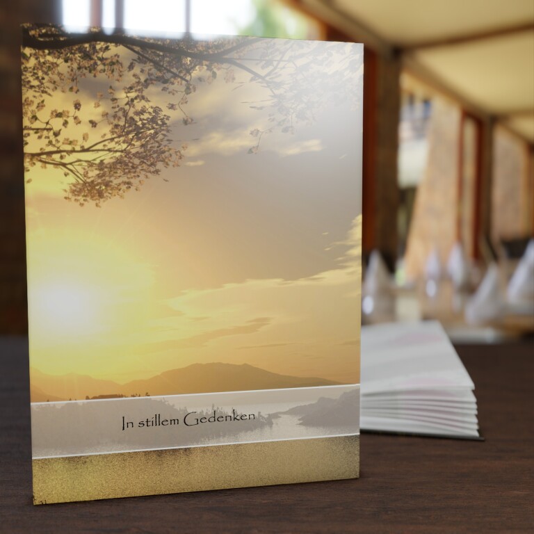 Das Motiv des Sonnenuntergangs steht für Ruhe, Abschied und den Übergang in einen neuen Frieden. Die warmen Farbtöne vermitteln Hoffnung und Trost in einer Zeit des Gedenkens.