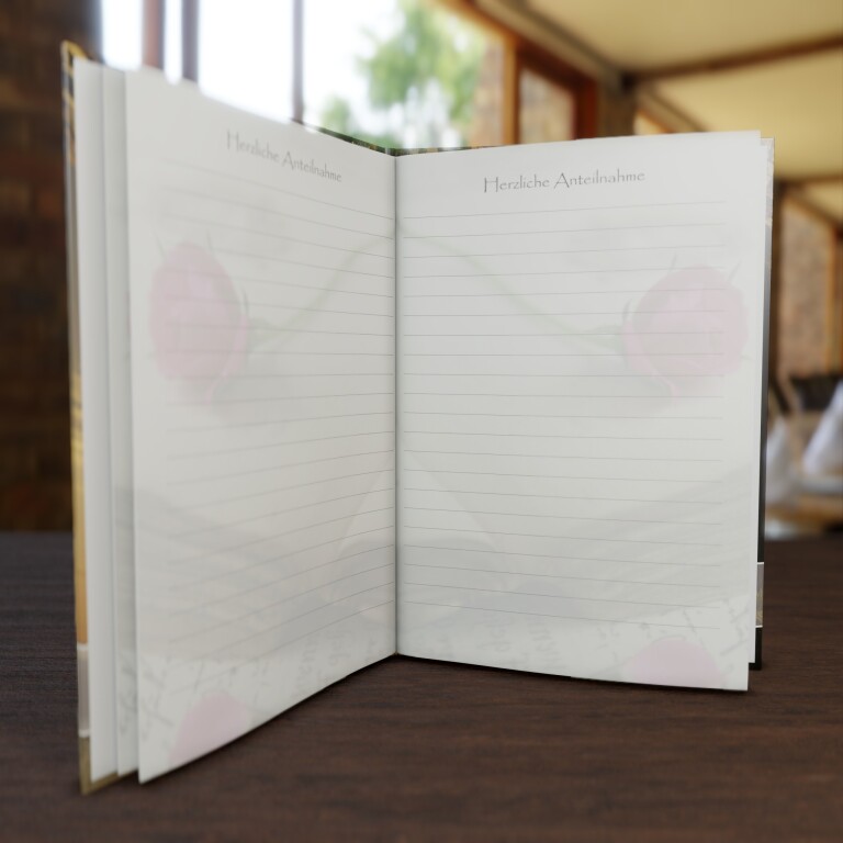 Dieses hochwertige Kondolenzbuch bewahrt die liebevollen Gedanken und Erinnerungen der Gäste als bleibendes Andenken für die Angehörigen.