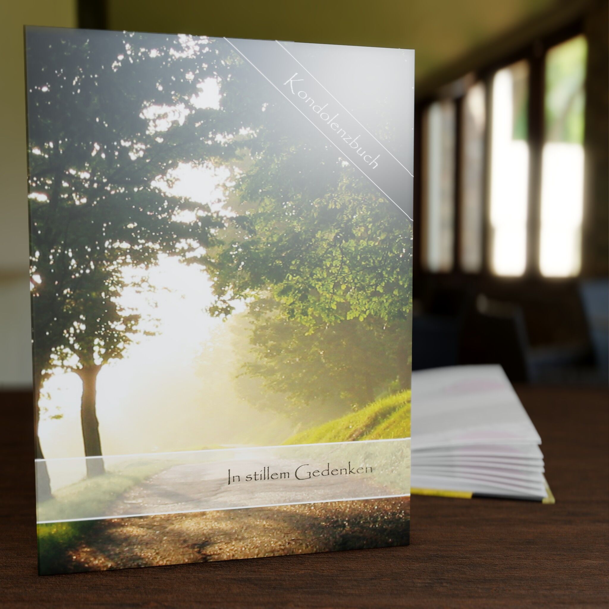 Kondolenzbuch mit dem Motiv „Waldweg“Mit diesem stilvollen Kondolenzbuch „Waldweg“ geben Sie Trauergästen die Möglichkeit, persönliche Worte, Erinnerungen und Beileidsbekundungen festzuhalten.