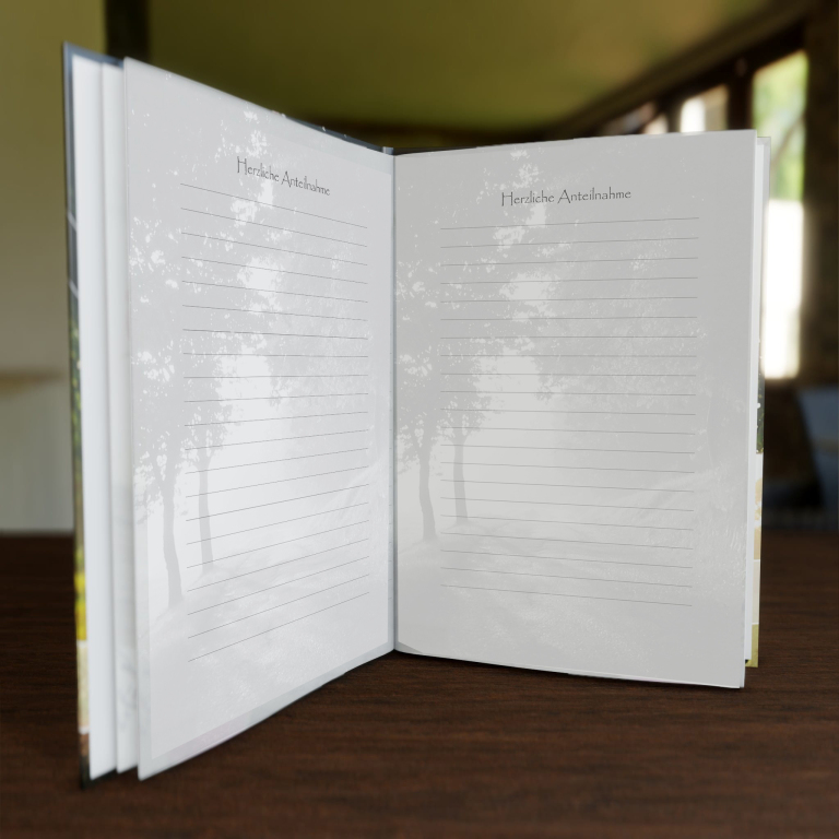 Dieses hochwertige Kondolenzbuch bewahrt die liebevollen Gedanken der Gäste als bleibende Erinnerung für die Hinterbliebenen.