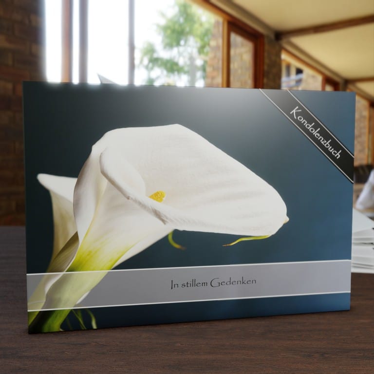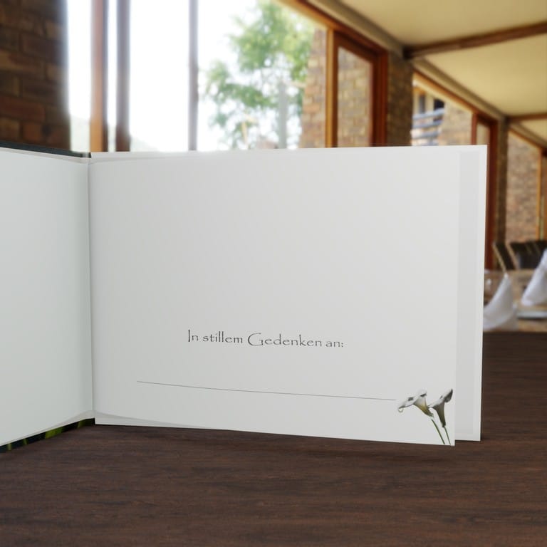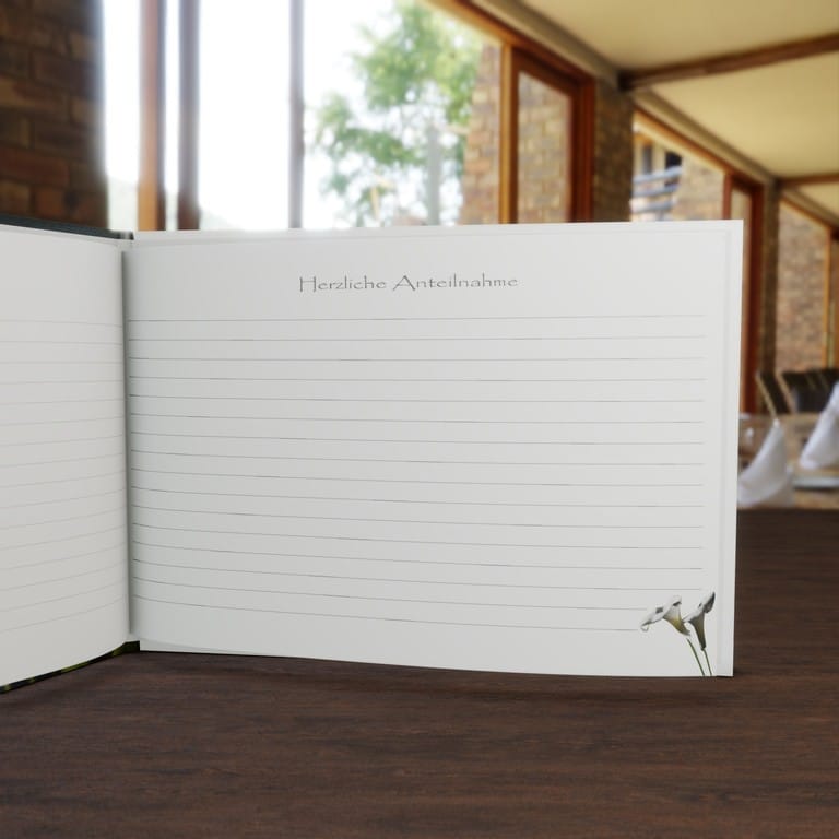 Mit einem Kondolenzbuch geben Sie Ihren Trauergästen die Gelegenheit für die Angehörigen und zum Gedenken an den Verstorbenen besonders liebevolle und besonnene Worte zu hinterlassen.