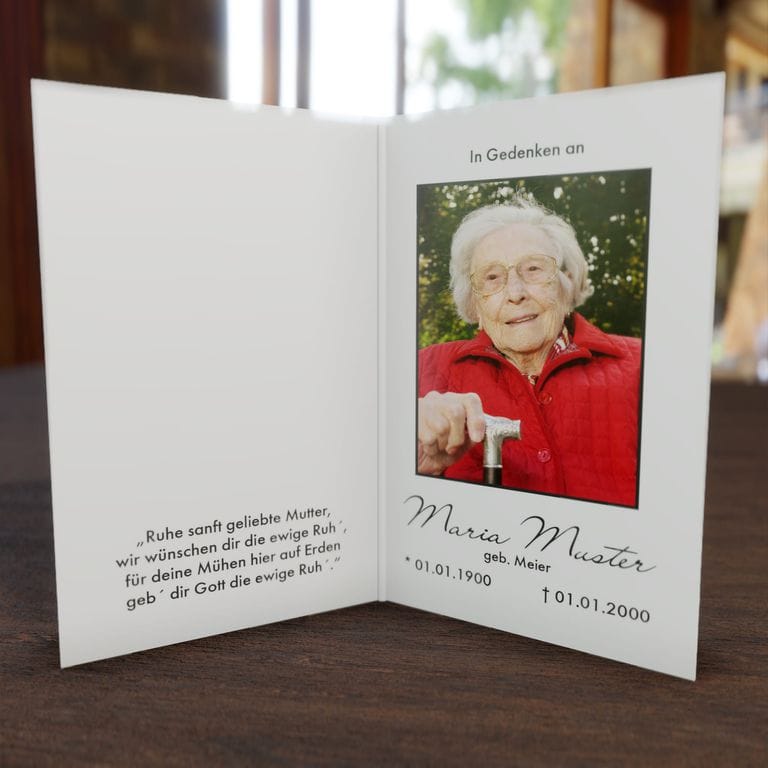 Unsere Sterbebilder werden auf hochwertigem, mattem Bilderdruckpapier (170g/m²) gefertigt und bieten eine angenehme Haptik.