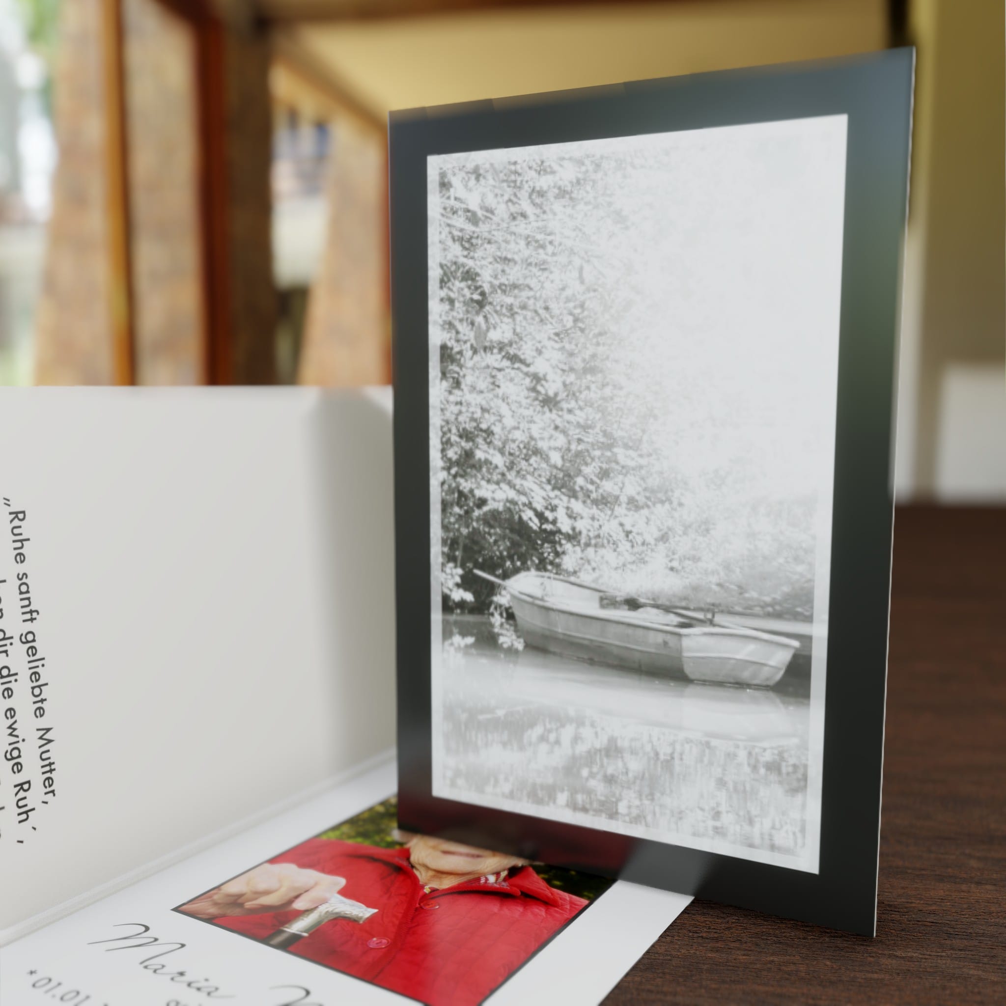 Elegantes Sterbebild mit dem Motiv „Boot mit Rahmen“.
