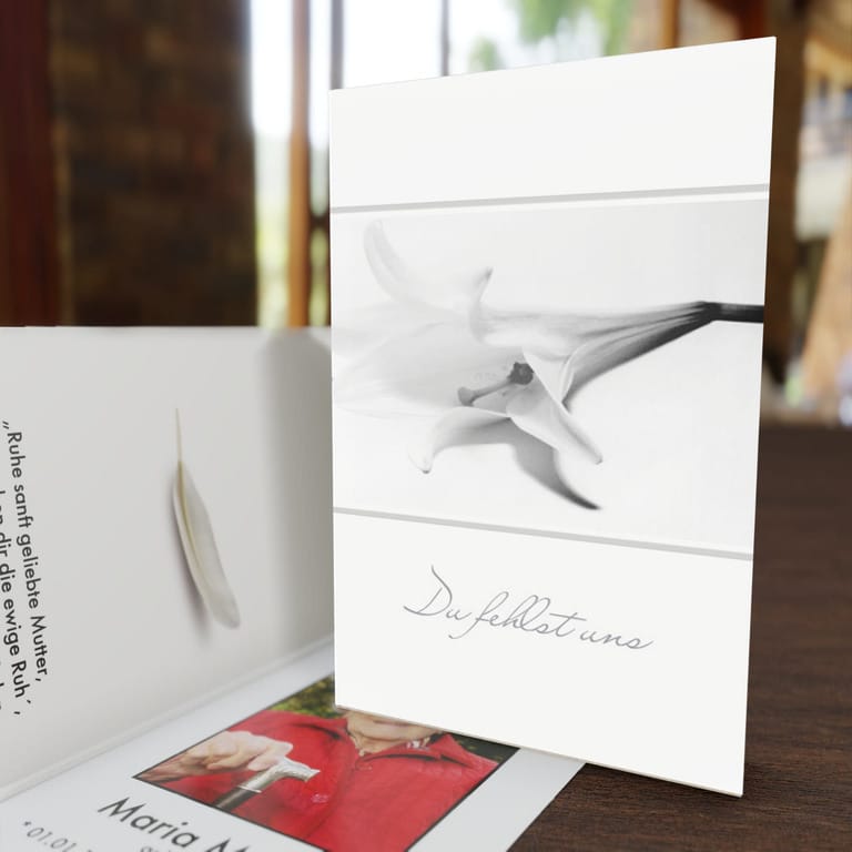 Unsere Sterbebilder werden auf hochwertigem, mattem Bilderdruckpapier (170g/m²) gefertigt und bieten eine angenehme Haptik.