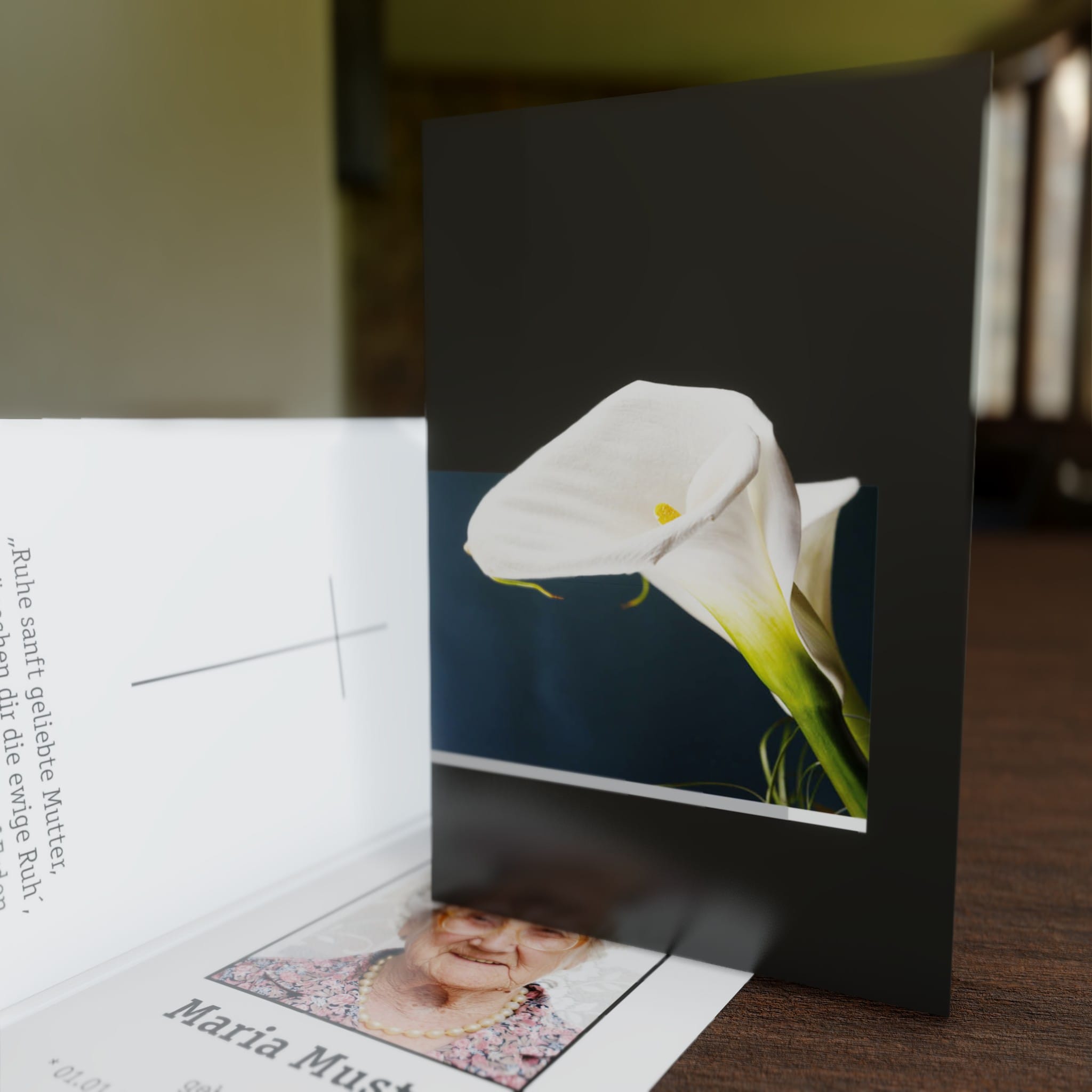 Elegantes Sterbebild mit dem Motiv Lilie modern im Rahmen modern.