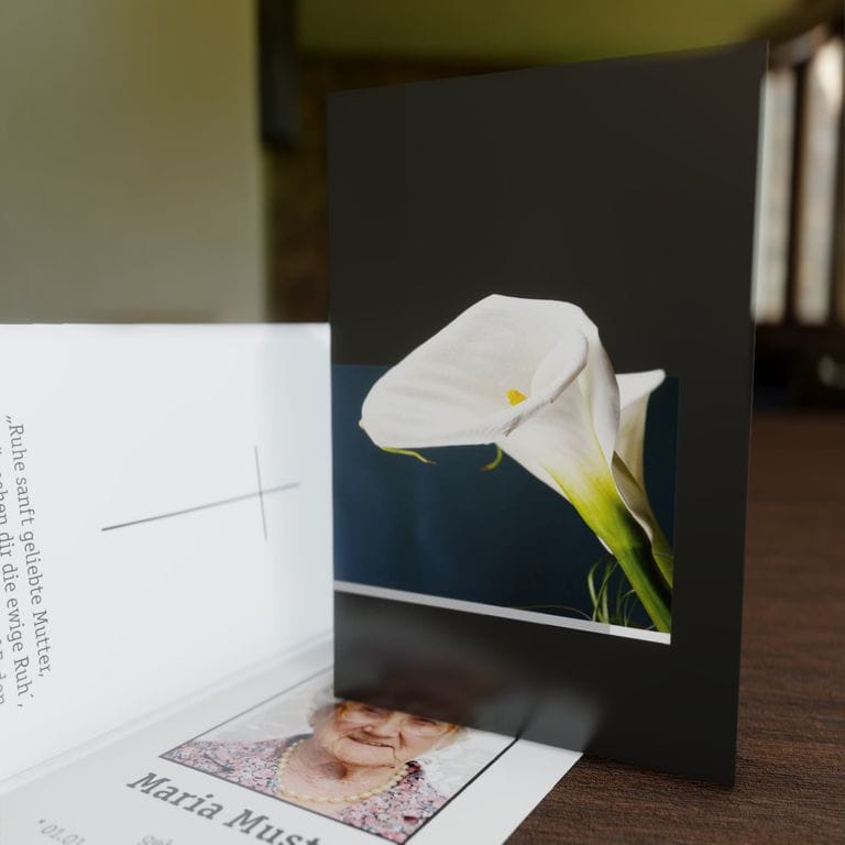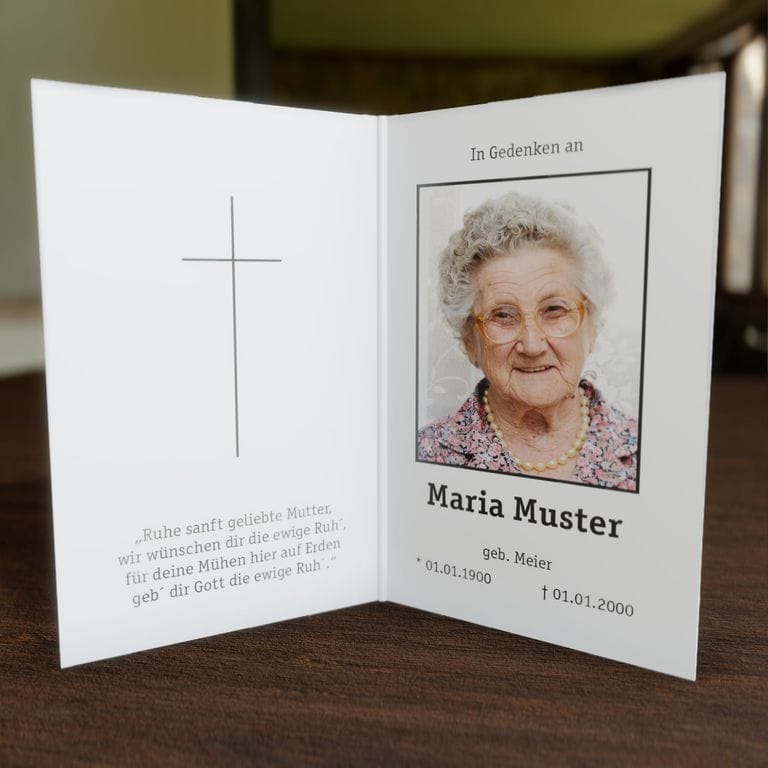 Unsere Sterbebilder werden auf hochwertigem, mattem Bilderdruckpapier (170g/m²) gefertigt und bieten eine angenehme Haptik.