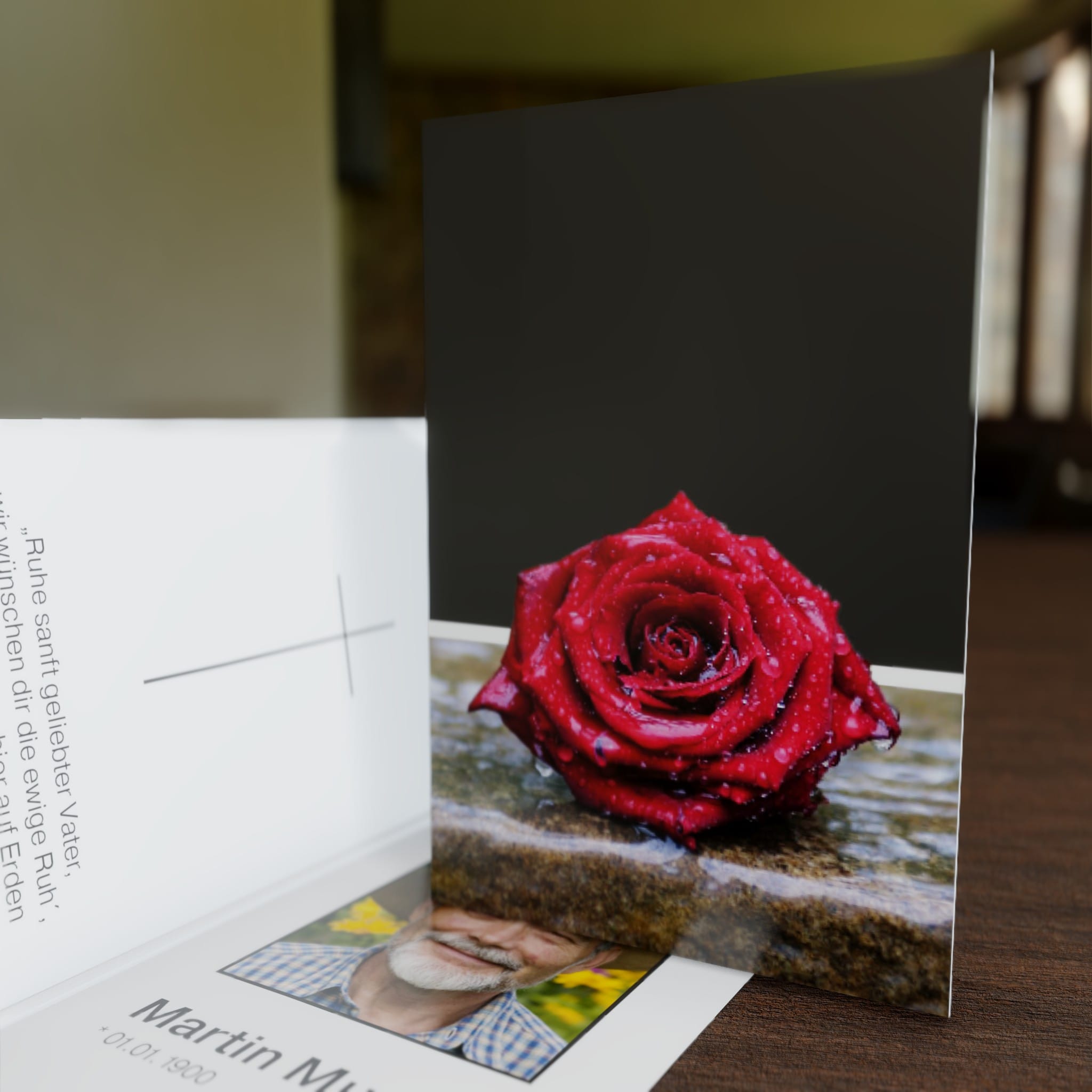 Überreichen Sie ihren Gästen dieses stilvolle Trauerbild „Regenrose“