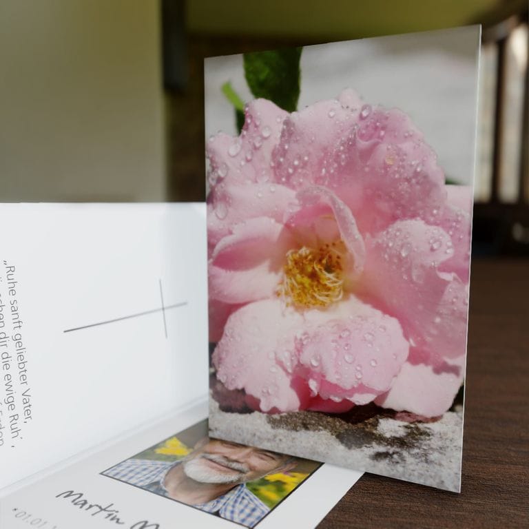 Unsere Sterbebilder werden auf hochwertigem, mattem Bilderdruckpapier (170g/m²) gefertigt und bieten eine angenehme Haptik.