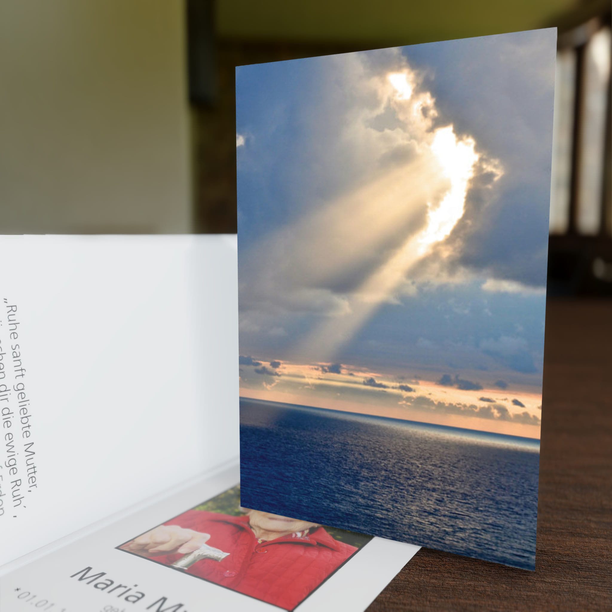 Unsere Sterbebilder werden auf hochwertigem, mattem Bilderdruckpapier (170g/m²) gefertigt und bieten eine angenehme Haptik.