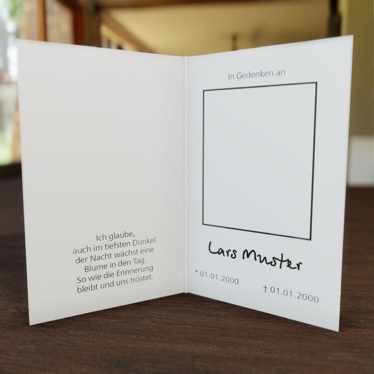 Unsere Sterbebilder werden auf hochwertigem, mattem Bilderdruckpapier (170g/m²) gefertigt und bieten eine angenehme Haptik.