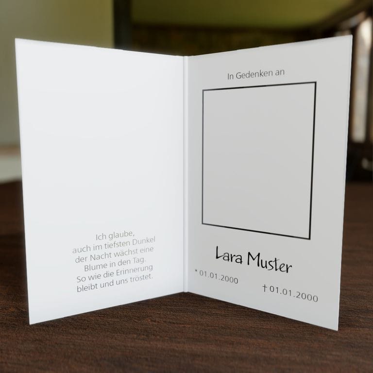 Unsere Sterbebilder werden auf hochwertigem, mattem Bilderdruckpapier (170g/m²) gefertigt und bieten eine angenehme Haptik.