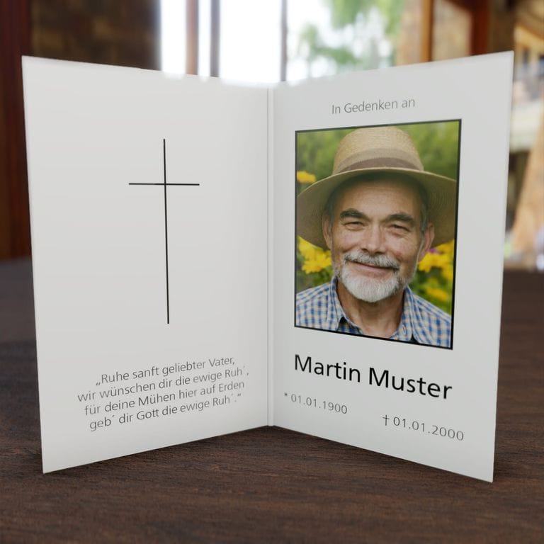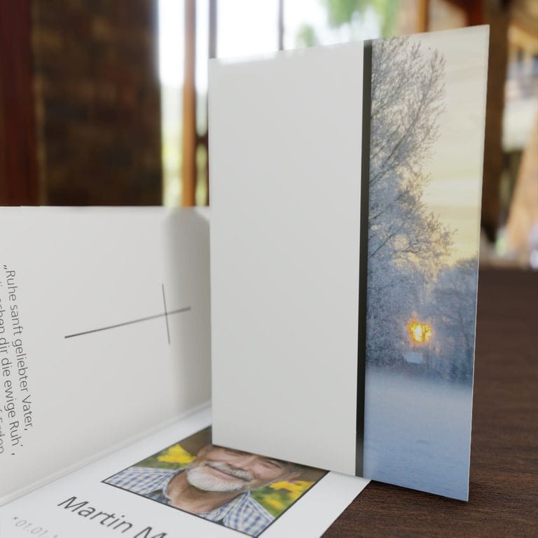 Unsere Sterbebilder werden auf hochwertigem, mattem Bilderdruckpapier (170g/m²) gefertigt und bieten eine angenehme Haptik.