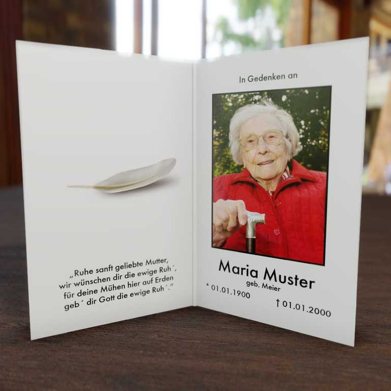 Unsere Sterbebilder werden auf hochwertigem, mattem Bilderdruckpapier (170g/m²) gefertigt und bieten eine angenehme Haptik.