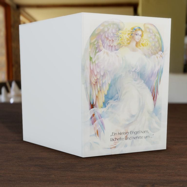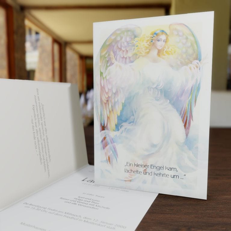 Informieren Sie nahestehende Verwandte und Freunde mit dieser stilvollen Trauer Klappkarte „Engel gemalt hell“ über den eingetretenen Trauerfall und den Termin für die Trauerfeier.
