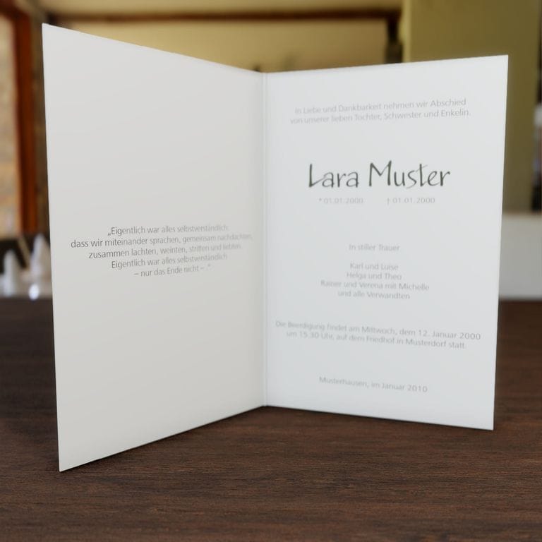 Diese Trauerkarte ist 4-seitig und wird individuell für Sie in Farbe gedruckt.