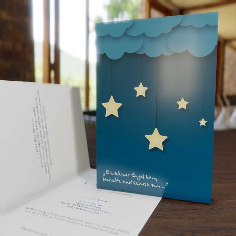 Trauerkarte mit dem Motiv "Sternen-Mobile". Informieren Sie nahestehende Verwandte und Freunde mit dieser stilvollen Trauer Klappkarte „Sternenhimmel“ über den eingetretenen Trauerfall und den Termin für die Trauerfeier.