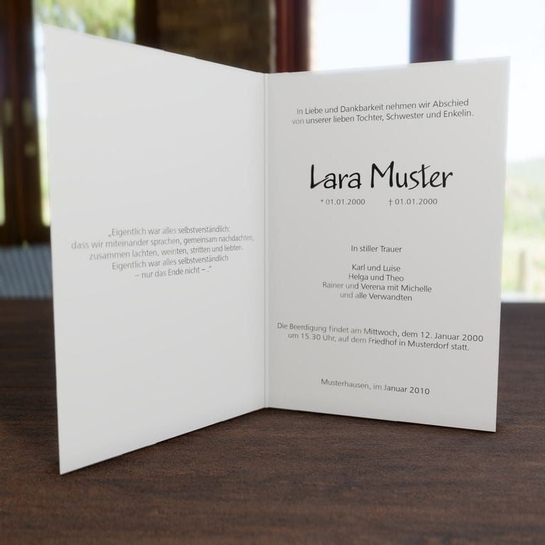 Diese Trauerkarte ist 4-seitig und wird individuell für Sie in Farbe gedruckt.