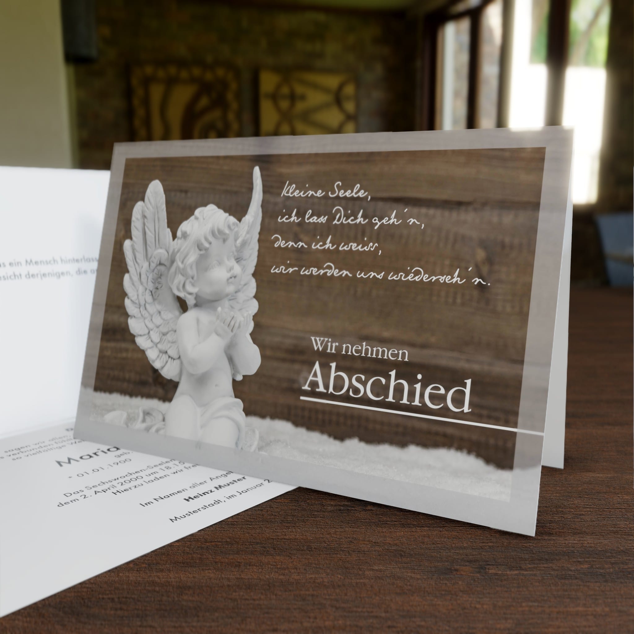 Informieren Sie nahestehende Verwandte und Freunde mit dieser dezenten Trauer Klappkarte „Kleiner Engel“ über den eingetretenen Trauerfall und den Termin für die Trauerfeier.