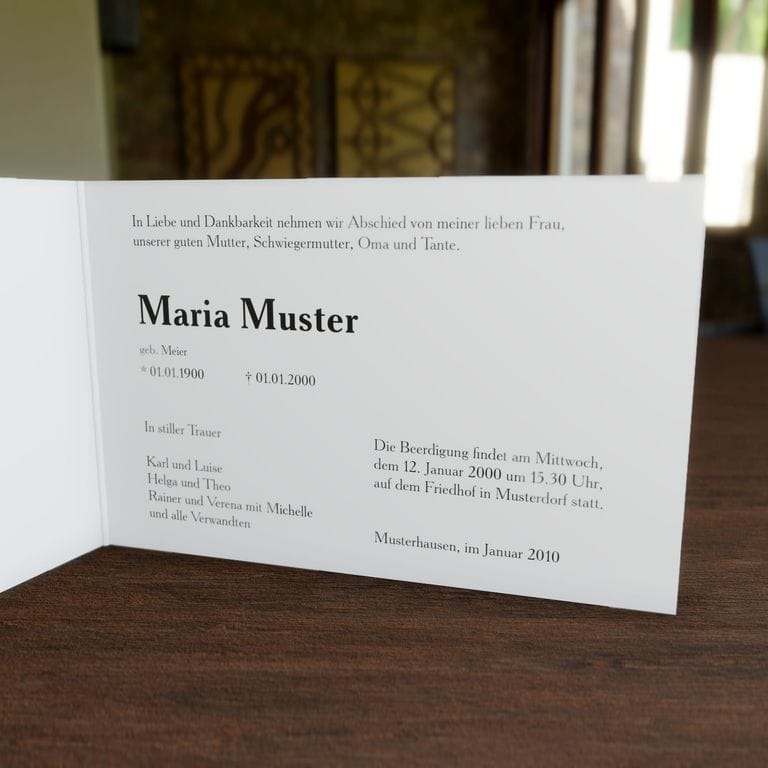 Informieren Sie nahestehende Verwandte und Freunde mit dieser dezenten Trauer Klappkarte „Halbmond“ über den eingetretenen Trauerfall und den Termin für die Trauerfeier.