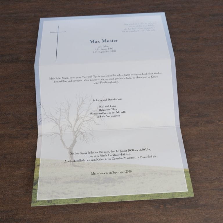 Informieren Sie nahestehende Verwandte und Freunde mit diesem modernen Trauerbrief „Baum auf Wiese“ über den eingetretenen Trauerfall und den Termin für die Trauerfeier.