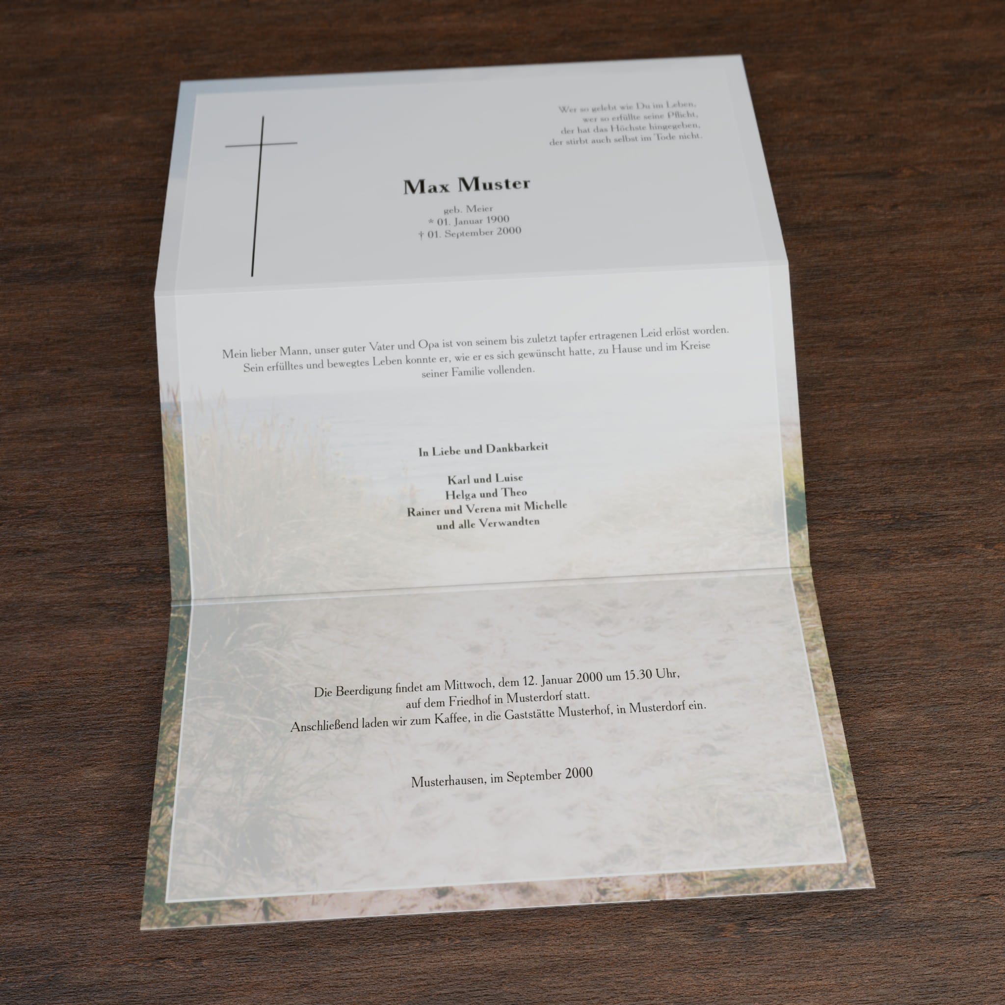 Informieren Sie nahestehende Verwandte und Freunde mit diesem modernen Trauerbrief „Dünen“ über den eingetretenen Trauerfall und den Termin für die Trauerfeier.