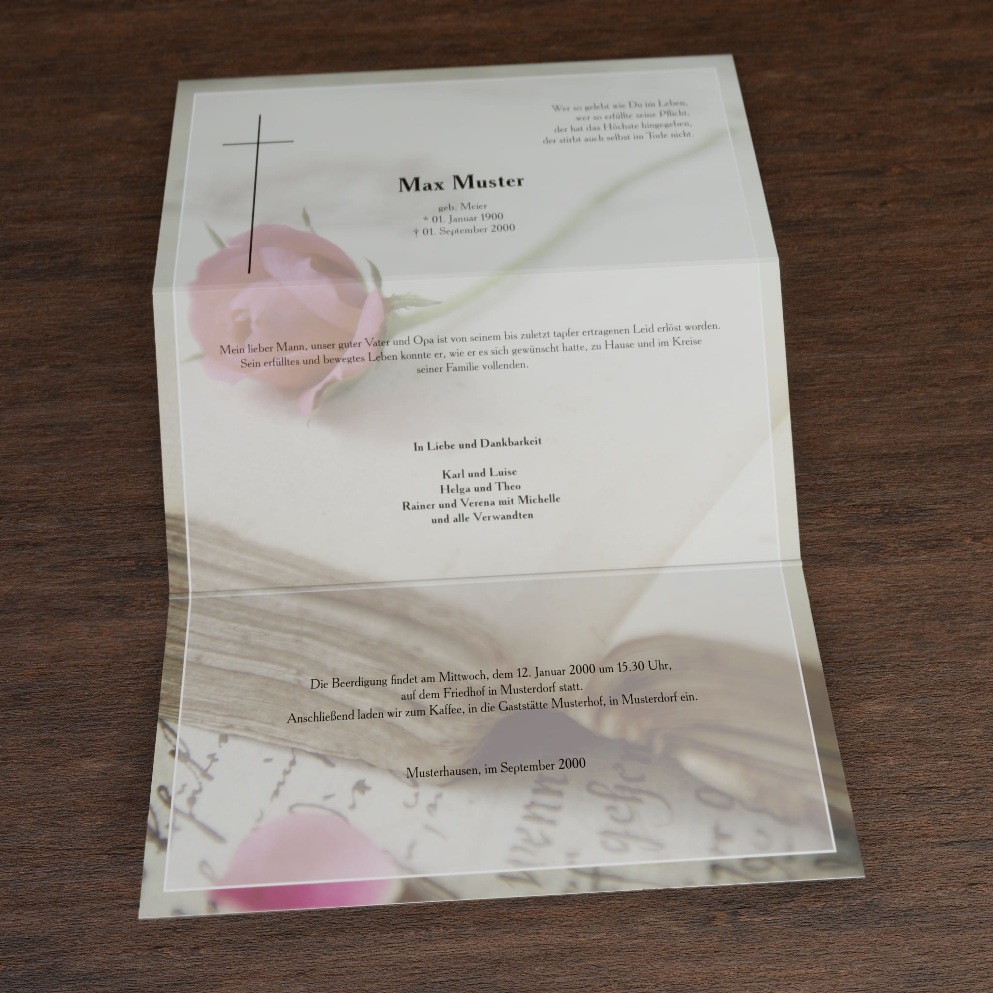 Informieren Sie nahestehende Verwandte und Freunde mit diesem modernen Trauerbrief „Rosenbuch“ über den eingetretenen Trauerfall und den Termin für die Trauerfeier.