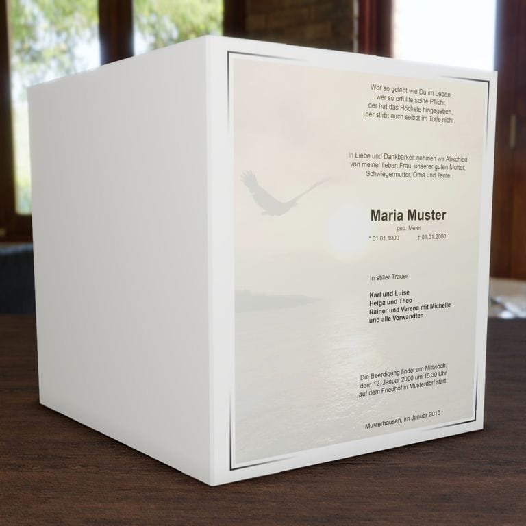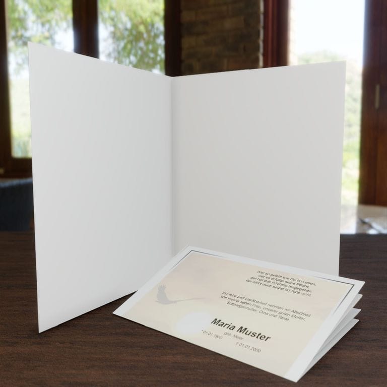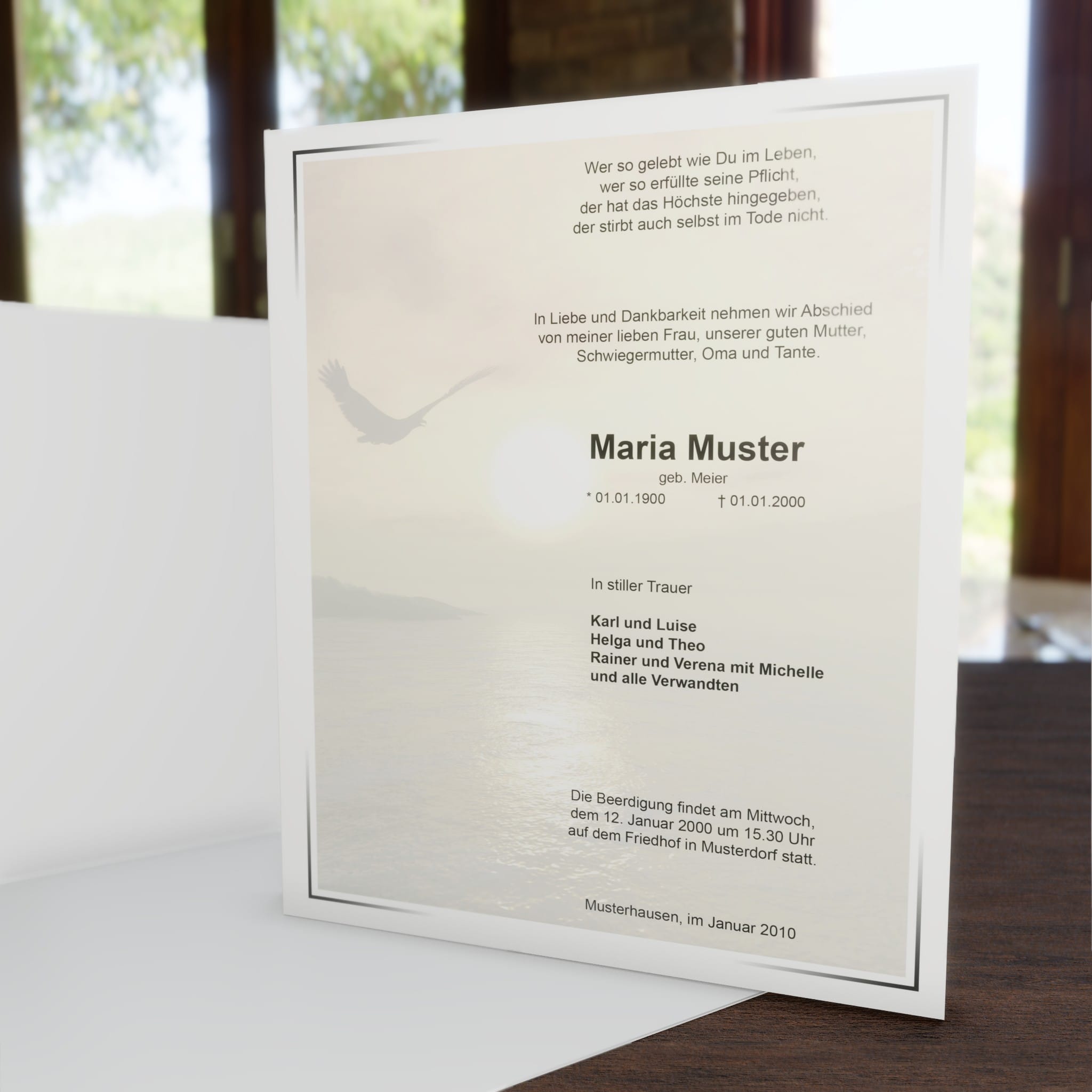 Informieren Sie nahestehende Verwandte und Freunde mit diesem klassischen Trauerbrief „Möwe u. Sonne“ über den eingetretenen Trauerfall und den Termin für die Trauerfeier.