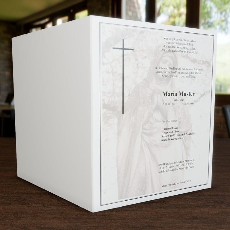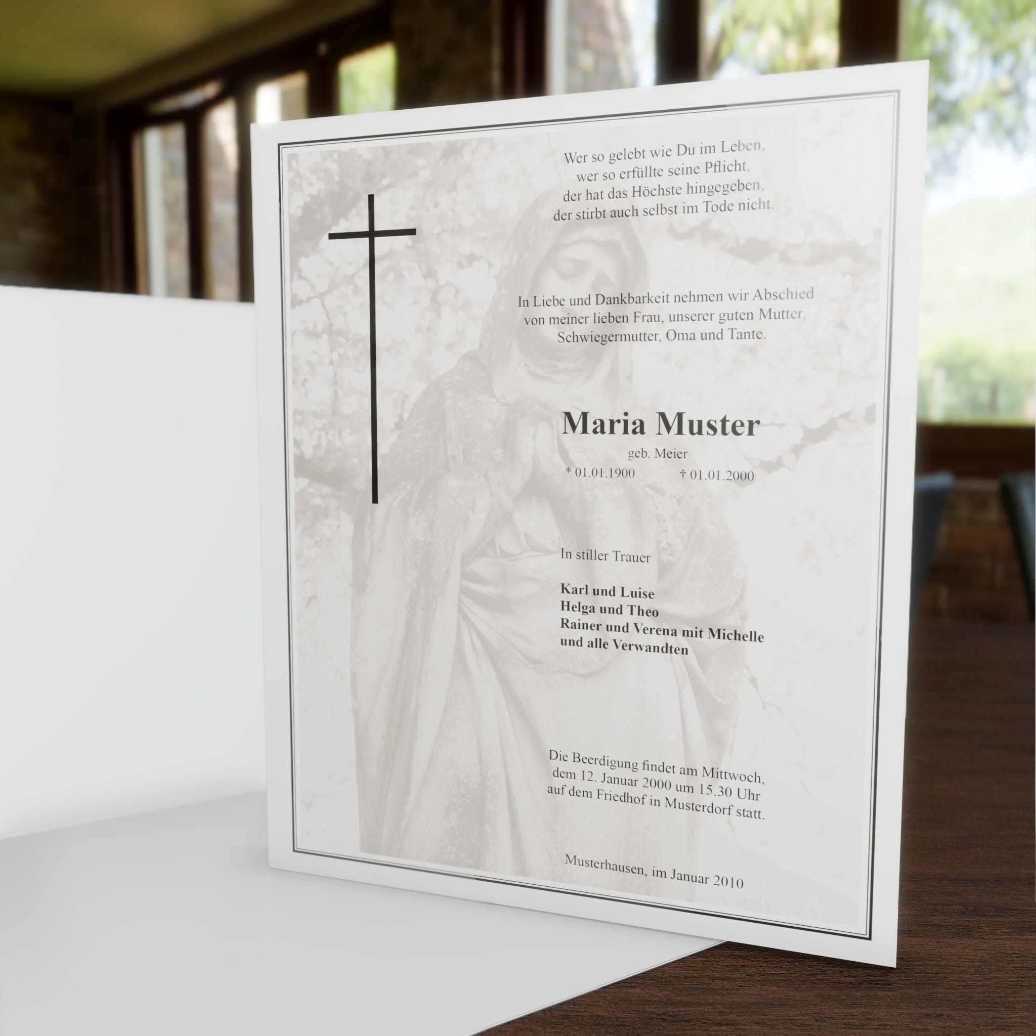 Informieren Sie nahestehende Verwandte und Freunde mit diesem klassischen Trauerbrief „Maria betend“ über den eingetretenen Trauerfall und den Termin für die Trauerfeier.