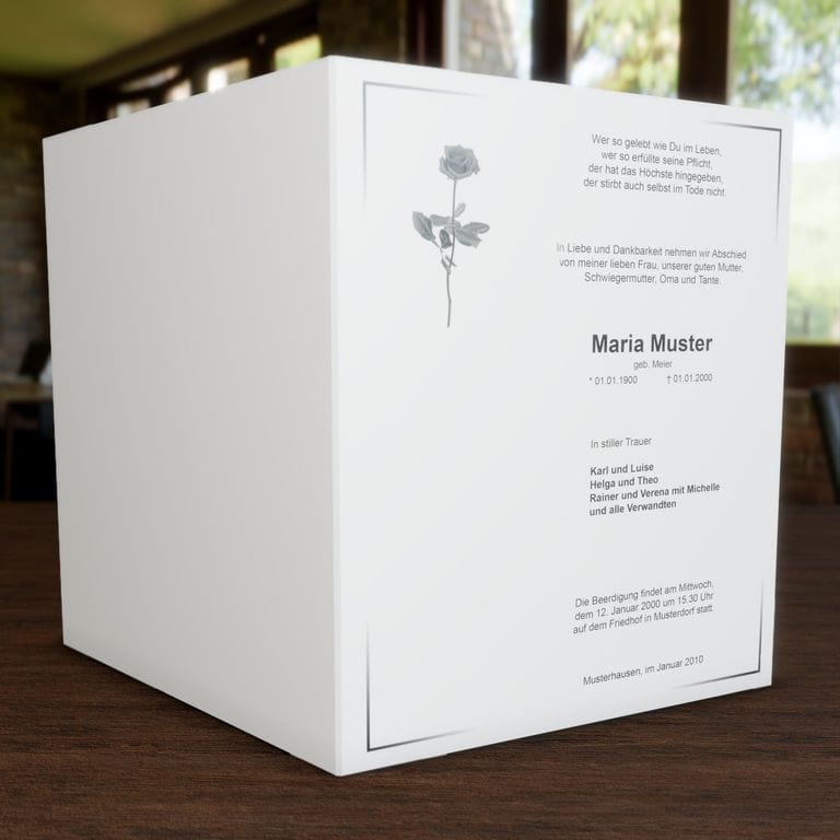 Unsere Trauerbriefe werden auf hochwertigem 120g/m² Papier gefertigt – wahlweise in dezentem Creme, edlem Leinen oder klassisch mattem Weiß. So bieten sie nicht nur eine angenehme Haptik, sondern unterstreichen auch die besondere Wertigkeit Ihrer Mitteilung.