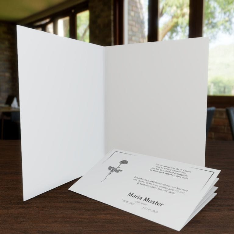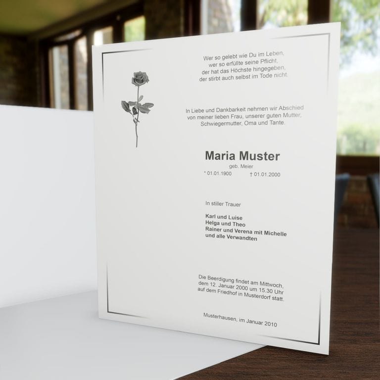 Informieren Sie nahestehende Verwandte und Freunde mit diesem klassischen Trauerbrief „Stielrose“ über den eingetretenen Trauerfall und den Termin für die Trauerfeier.