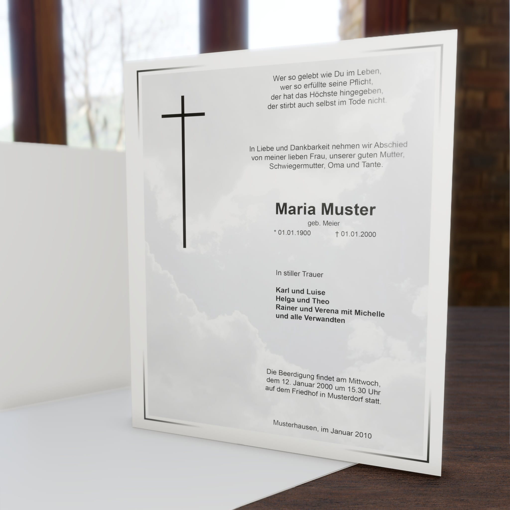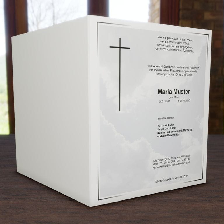 Informieren Sie nahestehende Verwandte und Freunde mit diesem klassischen Trauerbrief „Wolkenhimmel“ über den eingetretenen Trauerfall und den Termin für die Trauerfeier.