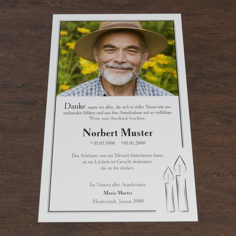 Diese Trauerdankkarte ist 2-seitig und wird individuell für Sie in Farbe gedruckt.