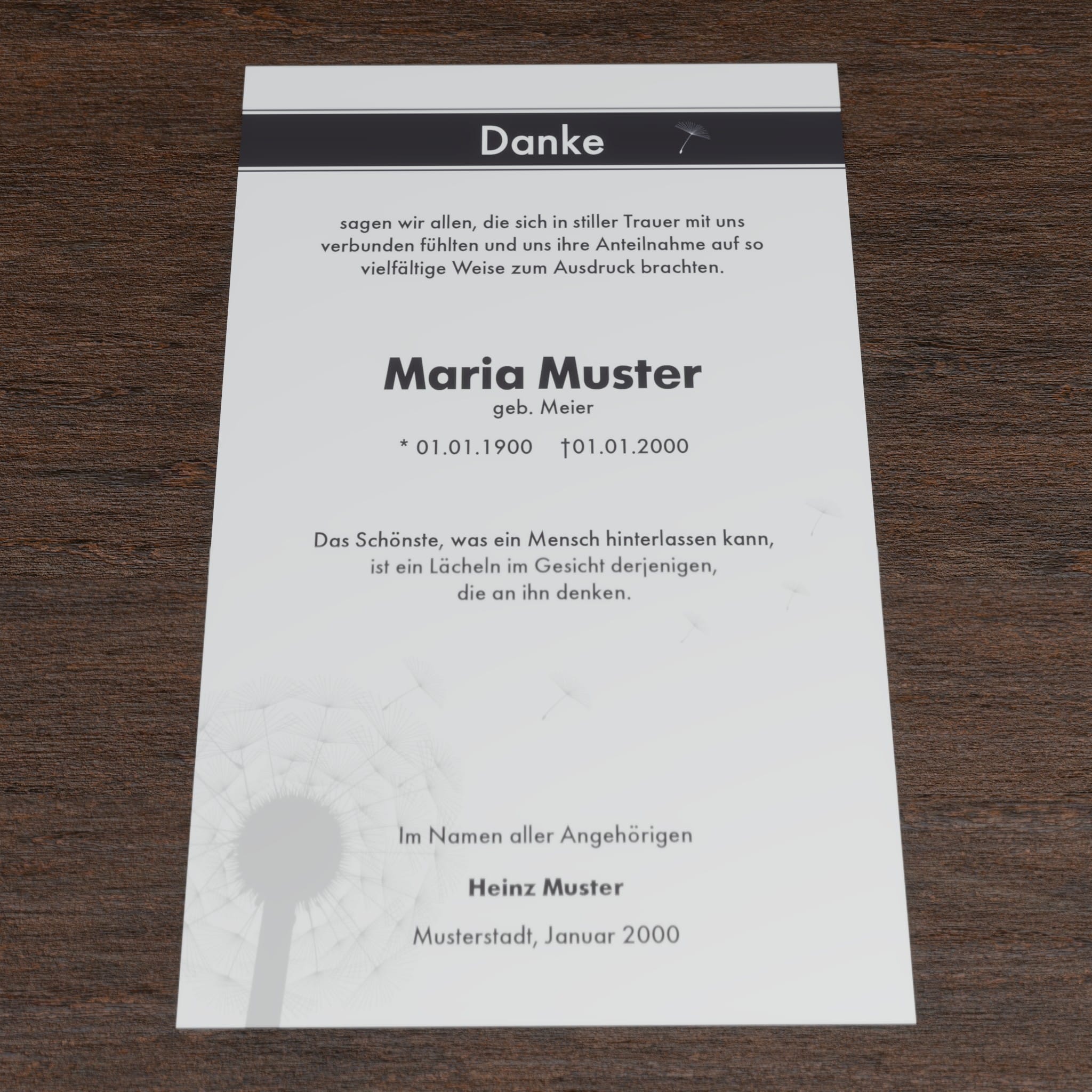 Trauerdanksagung mit dem Motiv "Leichte Pusteblume" im klassischen einseitigem Querformat. Bedanken Sie sich stilvoll mit der Danksagungskarte „Leichte Pusteblume“ für die erwiesene Anteilnahme, den Trost und die Unterstützung jeglicher Art in der Zeit der Trauer.