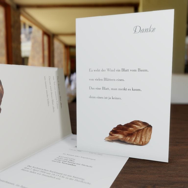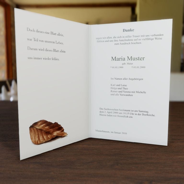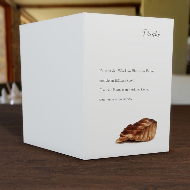 Trauer Danksagung mit Blatt im klassischen Hochformat. Bedanken Sie sich stilvoll mit der Danksagungskarte „Blatt“ für die erwiesene Anteilnahme,