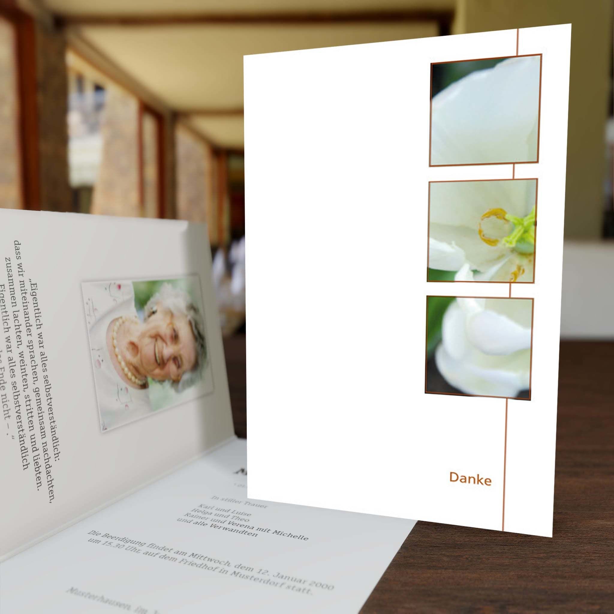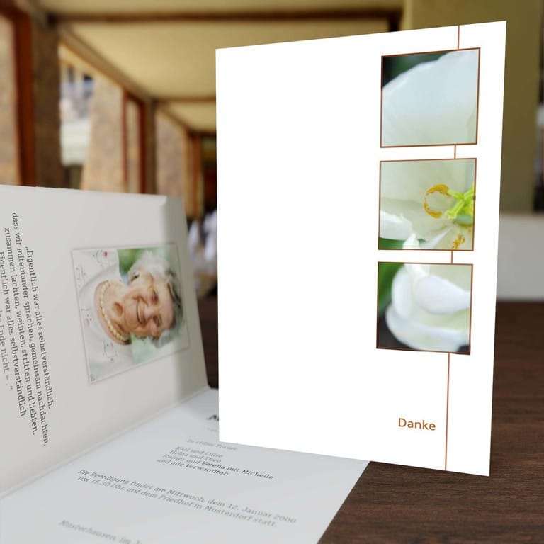 Diese Trauerdankkarte ist 4-seitig und wird individuell für Sie in Farbe gedruckt.