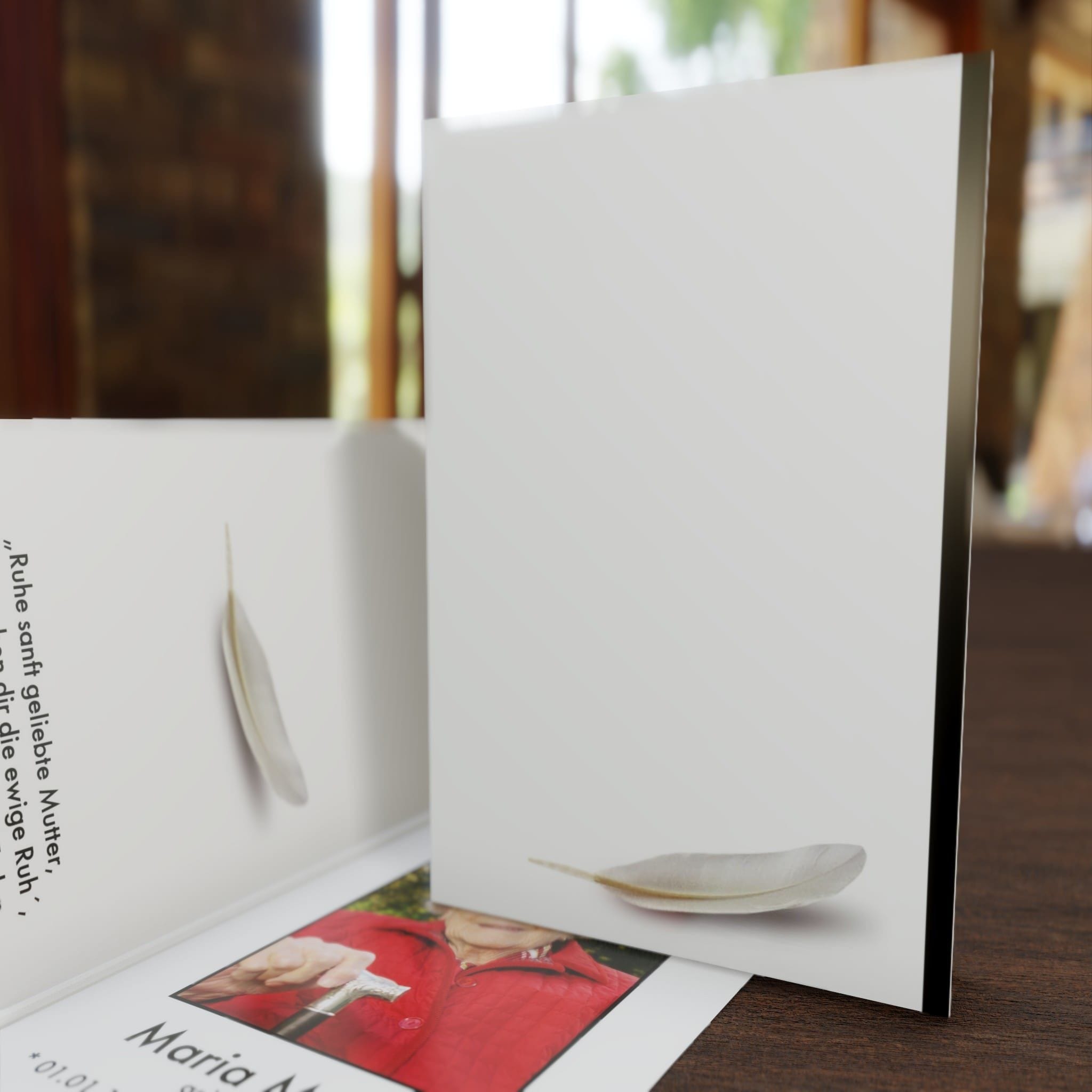 Trauer Danksagung mit dem Motiv "leichte Feder" im klassischen Hochformat. Bedanken Sie sich stilvoll mit der Danksagungskarte „leichte Feder“ für die erwiesene Anteilnahme,
