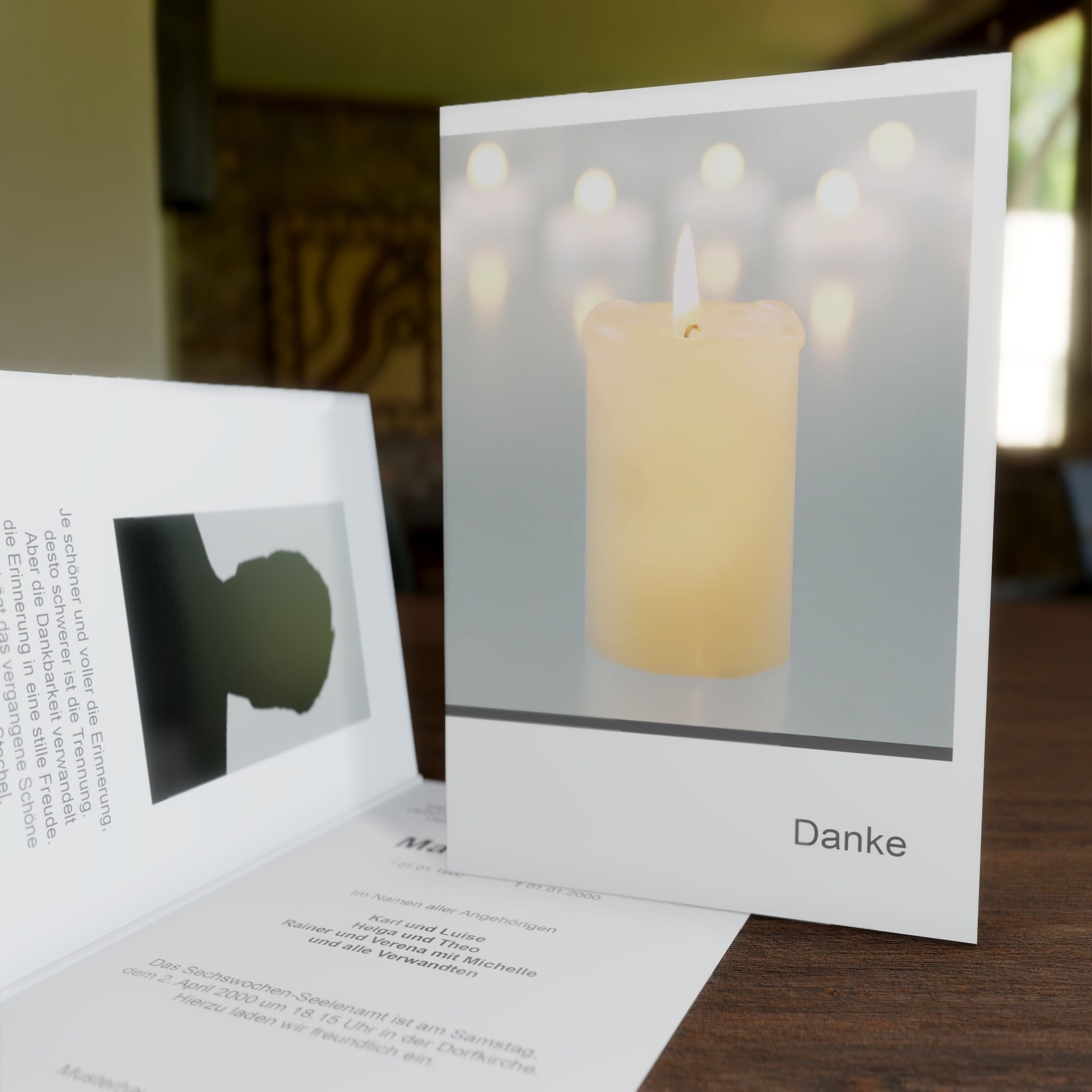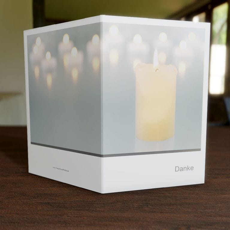 Trauer Danksagung mit sanfter Kerzenschein im klassischen Hochformat. Bedanken Sie sich stilvoll mit der Danksagungskarte „Kerzenschein“ für die erwiesene Anteilnahme,