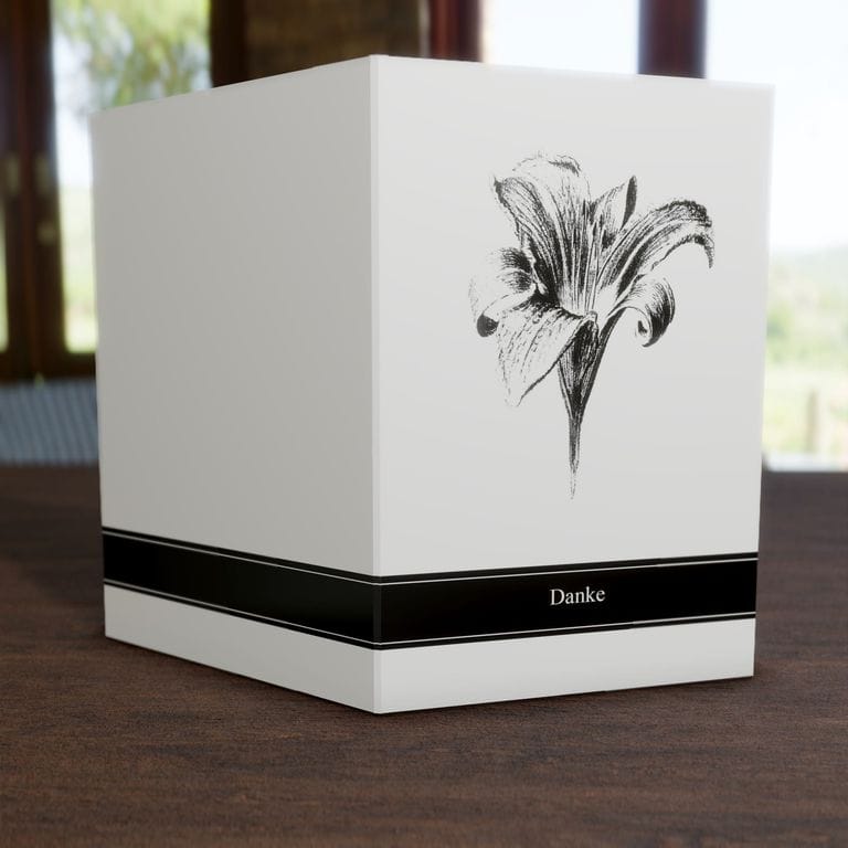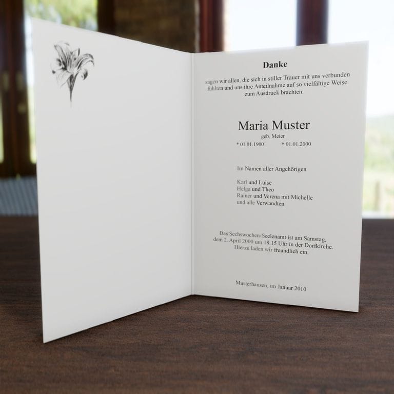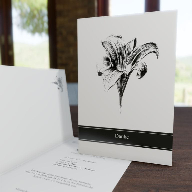 Informieren Sie nahestehende Verwandte und Freunde mit dieser stilvollen Trauer Klappkarte „Lilie“ über den eingetretenen Trauerfall und den Termin für die Trauerfeier.
