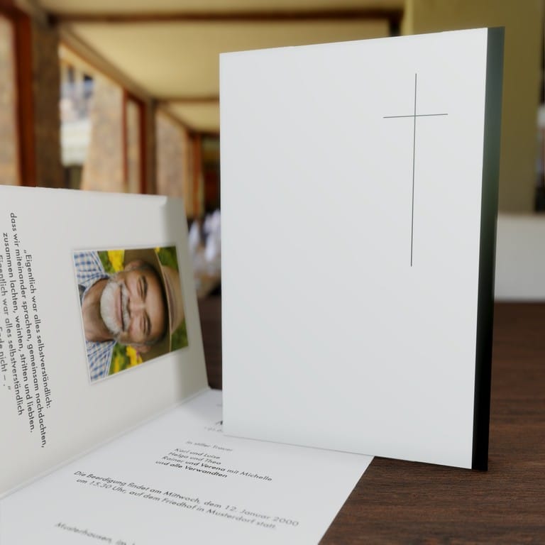Trauer Danksagung mit schlichtem Kreuz im klassischen Hochformat. Für liebe Menschen, die Ihnen in schwerer Zeit eine Stütze waren: die Danksagungskarte, schlichtes Kreuz.