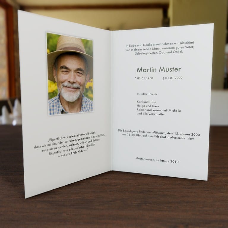Diese Trauerdankkarte ist 4-seitig und wird individuell für Sie in Farbe gedruckt.