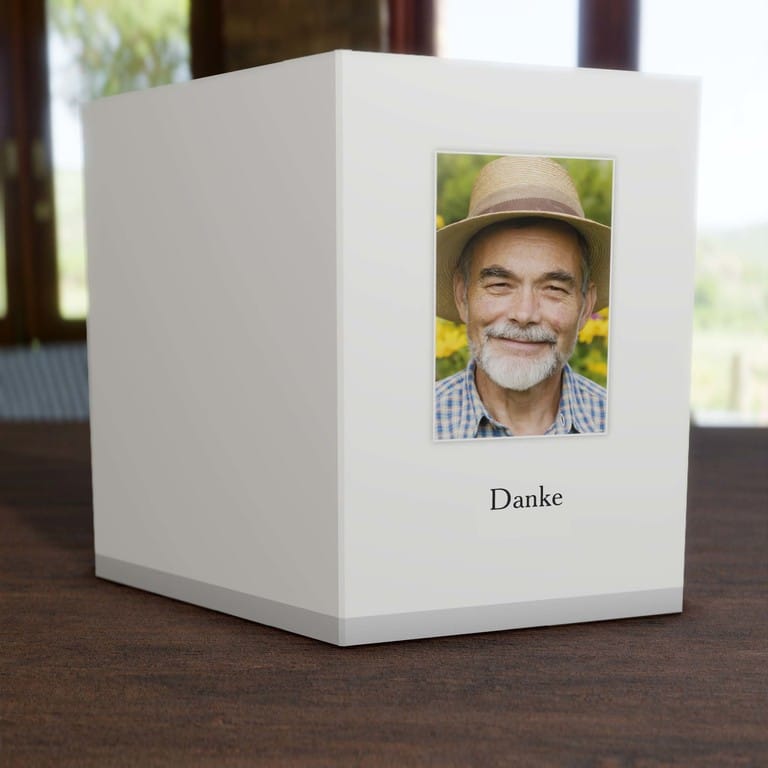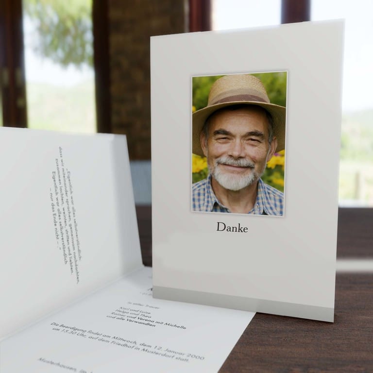 Diese Trauerdankkarte ist 4-seitig und wird individuell für Sie in Farbe gedruckt.
