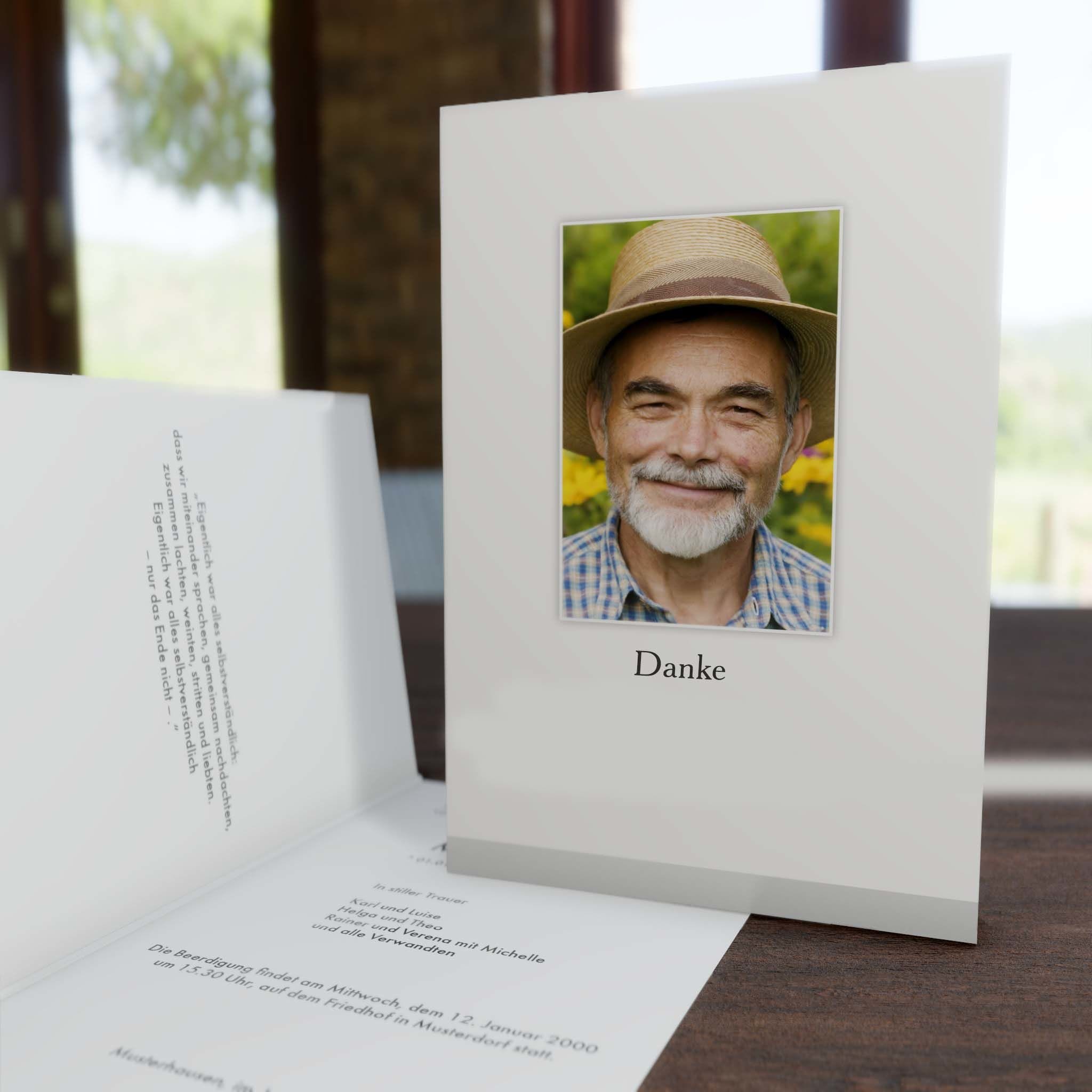 Trauer Danksagung mit dem Motiv "Schlichtes Portrait" im klassischen Hochformat. Bedanken Sie sich stilvoll mit der Danksagungskarte „Schlichtes Portrait“ für die erwiesene Anteilnahme,