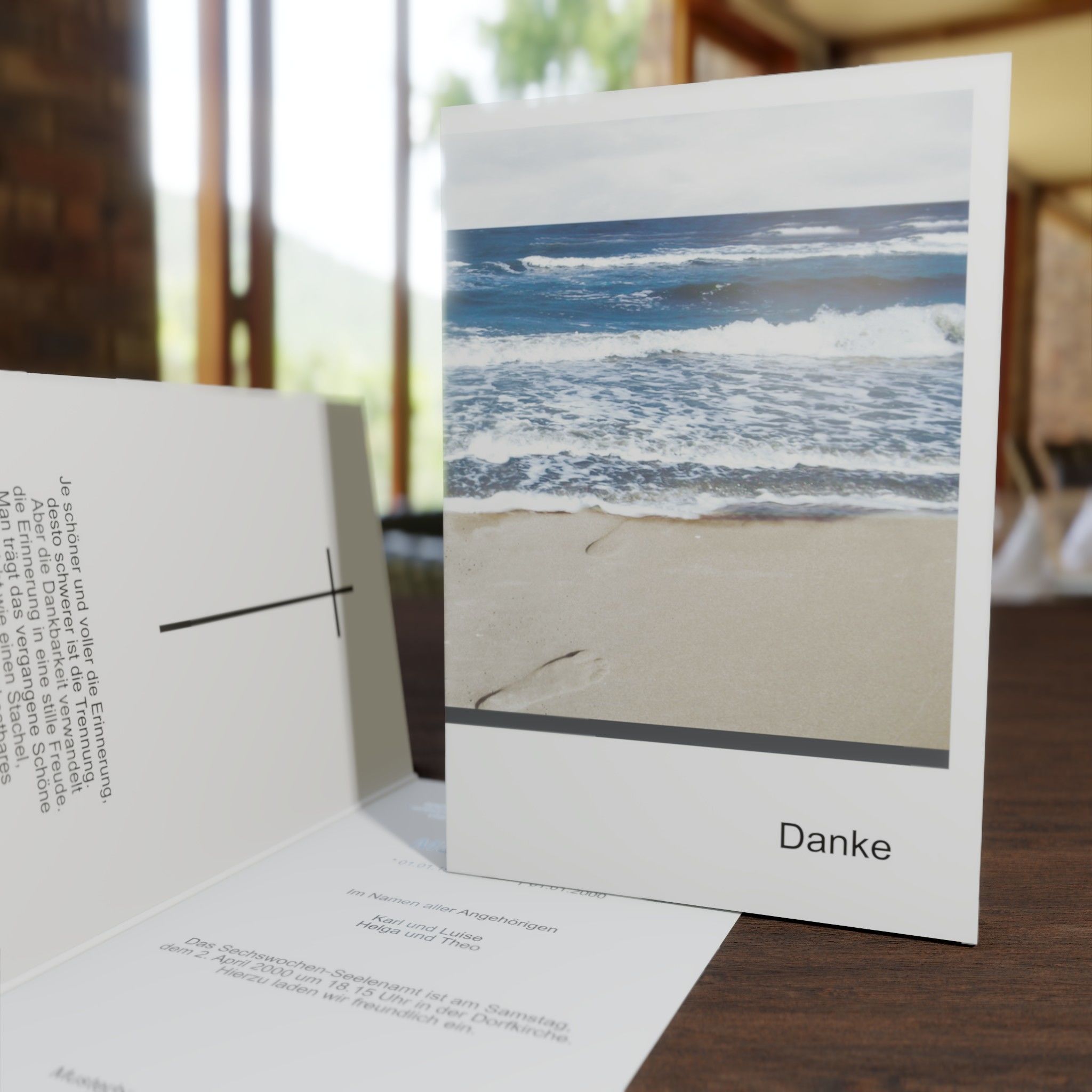 Trauer Danksagung mit blauem Meer im klassischen Hochformat. Bedanken Sie sich stilvoll mit der Danksagungskarte „blaues Meer“ für die erwiesene Anteilnahme,