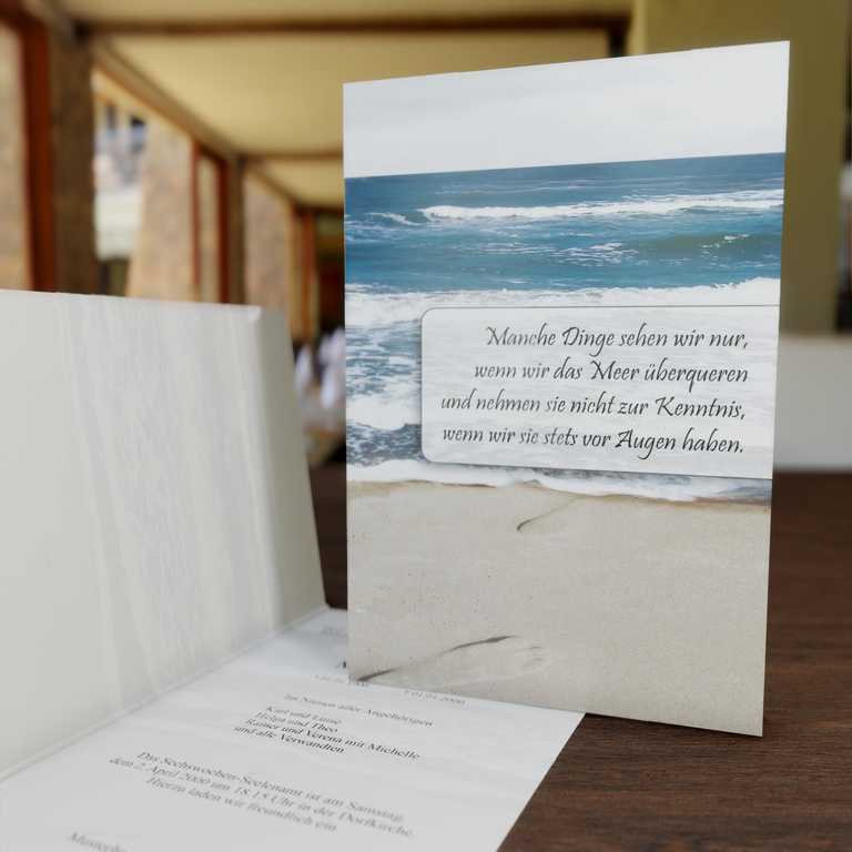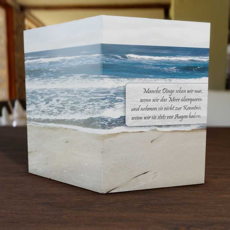 Trauer Danksagung mit Strand und Meer im klassischen Hochformat. Bedanken Sie sich stilvoll mit der Danksagungskarte „Strand und Meer“ für die erwiesene Anteilnahme,